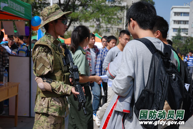 近日,湖北大學學生社團軍事觀察協會協助該校武裝部在校園內征兵,為了擴大影響力,該校軍事觀察協會還請來該校人民武裝學院接受過真槍實彈軍事訓練的兵哥哥當現場模特,為大家講授征兵的相關知識。