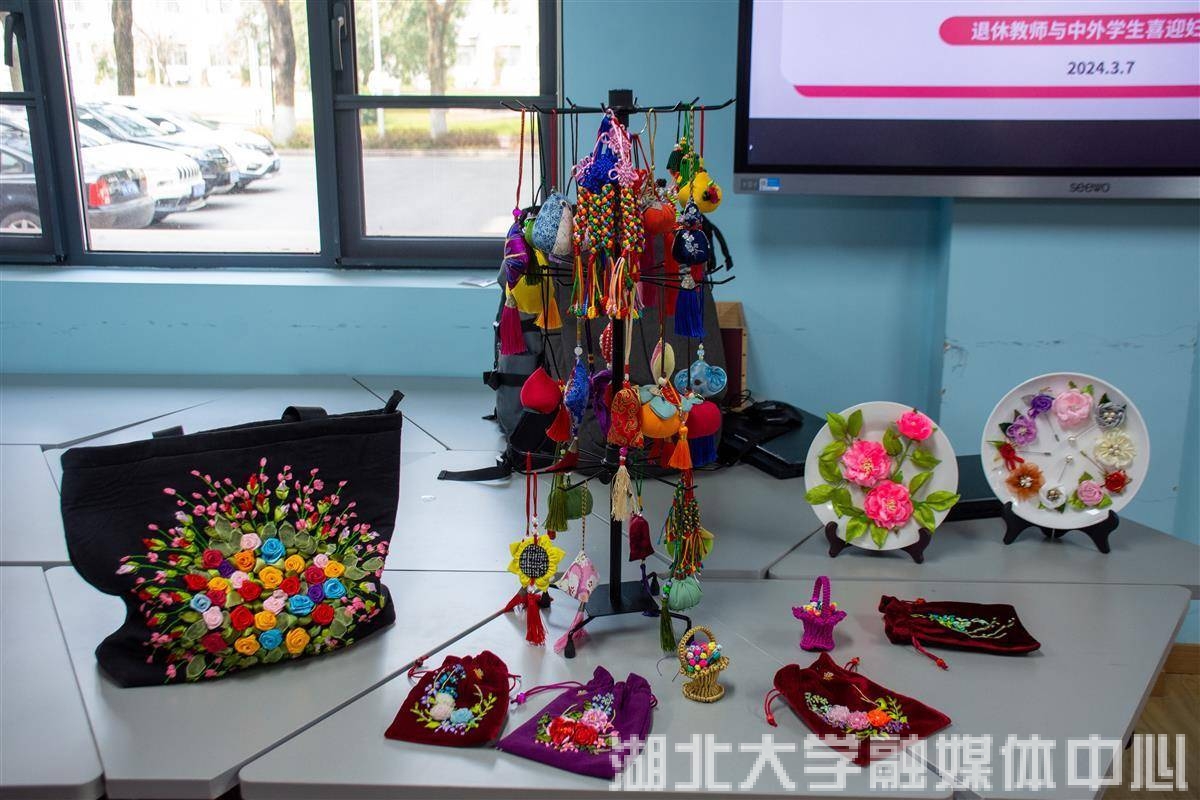 活動現場展示了老同志的手工藝品,有各種手機掛件、布包、小布袋、花盤、編織的小巧花籃等。布包和布袋上,手工制作的花卉精美逼真,洋溢著濃郁的春天氣息。一件件精美的手工藝品吸引了中外學生,紛紛拿出手機拍攝。