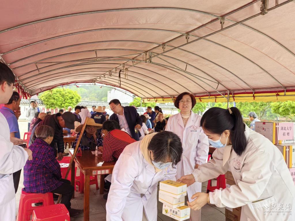 4月13日上午九點,在湖北大學醫院黨總支書記代漢文、院長曾祥英的帶領下,20余位醫務工作者來到湖北大學鄉村振興工作駐村點——英山縣石頭咀鎮大屋沖村開展送醫送藥大型義診活動。