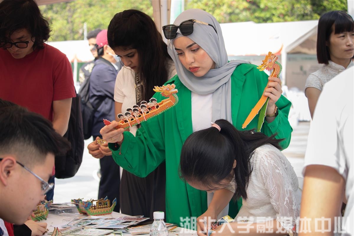 活動現(xiàn)場共設(shè)置12個(gè)荊楚文化展臺,高校中外學(xué)子一起擔(dān)任地方文化推薦官,分別介紹武漢、宜昌、襄陽等12個(gè)城市的地域文化。中外學(xué)生排起長隊(duì),爭先體驗(yàn)書法、剪紙、投壺等荊楚文化。2022級國際事務(wù)與國際關(guān)系專業(yè)學(xué)生周小喬今天一早就來到活動現(xiàn)場,除開參與活動,她與現(xiàn)場留學(xué)生們交流也很多,“大家都好熱情,我今天交到了好多外國朋友!已經(jīng)開始期待明年啦。”