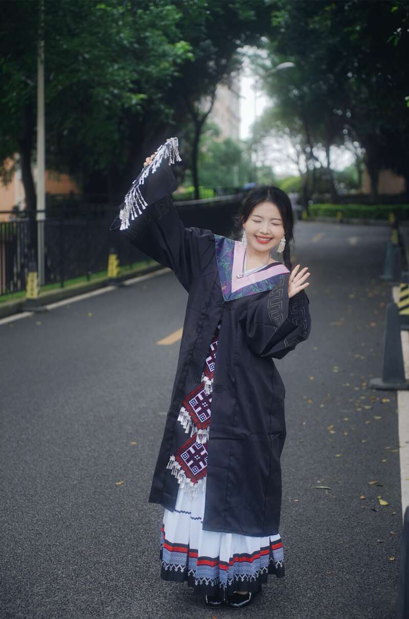 2024年6月15日,陽光學院2024屆畢業生王雪蓮同學將苗族特色服飾與學士服結合,在校園里拍照留念。