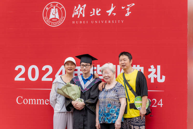 2024年6月18日,湖北大學數統學院本科畢業生王宗昊同父母和84歲的奶奶一起來到畢業典禮現場,三代人站在一起合影留念。湖北大學 林芳灝/攝