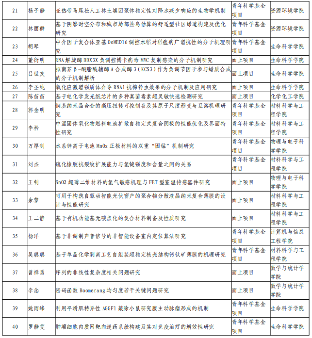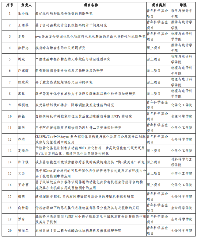 按項(xiàng)目類型,我校獲批面上項(xiàng)目18項(xiàng)、青年科學(xué)基金項(xiàng)目22項(xiàng);按科學(xué)部,獲批項(xiàng)目分布在六個(gè)科學(xué)部,其中生命科學(xué)部11項(xiàng)、數(shù)理科學(xué)部8項(xiàng)、化學(xué)科學(xué)部8項(xiàng)、工程與材料科科學(xué)部7項(xiàng)、信息科學(xué)部4項(xiàng)、醫(yī)學(xué)科學(xué)部部2項(xiàng);按學(xué)院,生命科學(xué)學(xué)院11項(xiàng)、材料科學(xué)與工程學(xué)院7項(xiàng)、物理與電子科學(xué)學(xué)院7項(xiàng)、化學(xué)化工學(xué)院6項(xiàng)、數(shù)學(xué)與統(tǒng)計(jì)學(xué)學(xué)院5項(xiàng)、資源環(huán)境學(xué)院3項(xiàng)、計(jì)算機(jī)與信息工程學(xué)院1項(xiàng)。