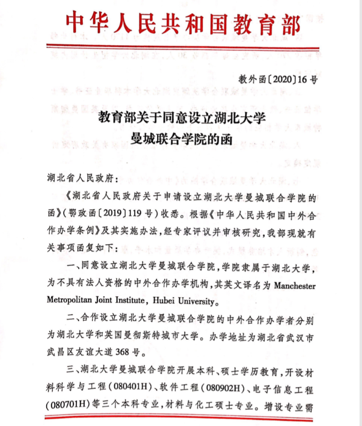 湖北大學(xué)與曼徹斯特城市大學(xué)的交流合作始于2015年,迄今已開展高層互訪、教師交流、聯(lián)合授課、合作研究、學(xué)生聯(lián)合培養(yǎng)等多種形式的合作交流活動,具有深厚的合作基礎(chǔ)。2015年12月,雙方達(dá)成聯(lián)合申辦“湖北大學(xué)曼城聯(lián)合學(xué)院”非獨立法人中外合作辦學(xué)機構(gòu)的意向。在兩校高層領(lǐng)導(dǎo)及學(xué)科專家前期充分溝通、論證的基礎(chǔ)上,兩校于2019年9月簽署聯(lián)合辦學(xué)協(xié)議,并按照申報流程逐級向湖北省教育廳、教育部提交申報材料。2019年12月18日,根據(jù)教育部國際司的工作安排,兩校高層領(lǐng)導(dǎo)聯(lián)合代表團赴京參加了集中評議答辯。2020年4月26日,教育部正式發(fā)函批準(zhǔn)設(shè)立“湖北大學(xué)曼城聯(lián)合學(xué)院”。兩校后續(xù)將進一步加強溝通,積極融合雙方優(yōu)質(zhì)教育資源,主動創(chuàng)新人才培養(yǎng)模式,全力提高學(xué)科建設(shè)水平,努力打造國際化師資團隊,使學(xué)院成為湖北大學(xué)國際化辦學(xué)的標(biāo)桿和示范。
