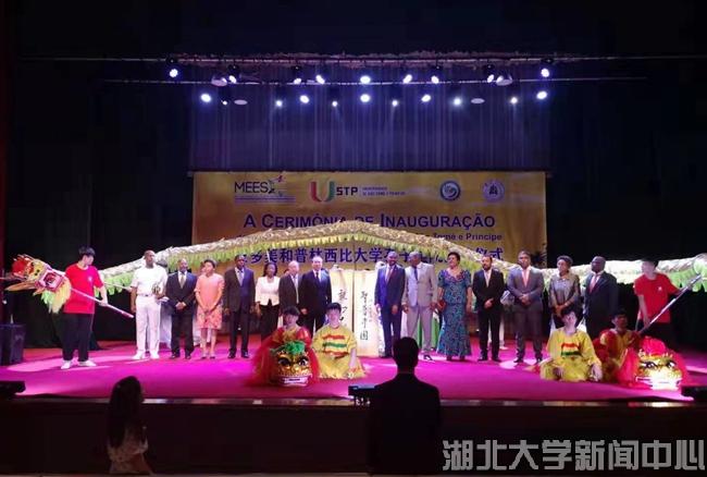當地時間7月10日,湖北大學在非洲首家孔子學院揭牌儀式在圣普議會大廈隆重舉行,湖北大學龍獅藝術團精彩獻藝。圣普總理熱蘇斯,中國駐圣普大使王衛,湖北大學校長謝紅星,圣普大學校長科斯塔,圣普政府高級官員,中國援圣普代表、中資機構代表,相關駐圣普外交人員、主要媒體,湖北大學師生及圣普大學師生共900余人觀看演出。