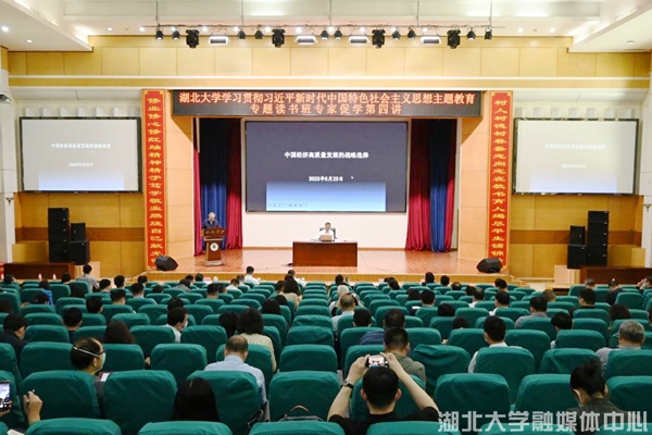 5月23日,學校開展學習貫徹習近平新時代中國特色社會主義思想主題教育專題讀書班專家促學第四講。中國國家創新與發展戰略研究會中國經濟研究中心主任、同濟大學特聘教授劉興華應邀作輔導報告。全體在校校領導,全校中層干部,民主黨派負責人、無黨派代表人士、僑聯負責人,商學院師生代表參加會議。校黨委書記謝紅星主持會議。