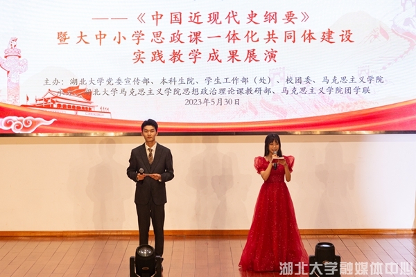 5月30日,湖北大學(xué)《中國近現(xiàn)代史綱要》暨大中小學(xué)思政課一體化共同體建設(shè)實踐教學(xué)成果展演在三號報告廳舉行。《中國近現(xiàn)代史綱要》課堂2022級學(xué)生通過情景劇、剪紙、說唱等多種形式進行實踐教學(xué)展演,增強青年學(xué)子歷史代入感、強國責(zé)任感、復(fù)興使命感。校黨委副書記祝欣出席活動。